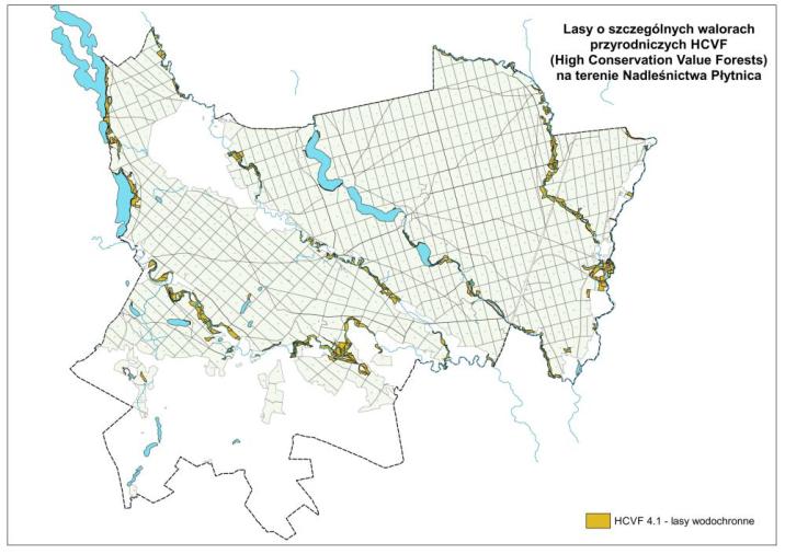 W związku ze stwierdzeniem podczas przeprowadzonego w dniach 03 - 05.11.2020 r. audytu gospodarki leśnej w systemie FSC niezgodności polegającej na niewłaściwym zakwalifikowaniu drzewostanów HCVF (High Conservation Value Forests) do kategorii 4.1 (lasy wodochronne), Nadleśnictwo Płytnica zweryfikowało zapisaną w obowiązującym planie urządzania lasu listę drzewostanów zakwalifikowanych do tej kategorii. Wyznaczenia drzewostanów dokonano na podstawie Kryteriów wyznaczania lasów o szczególnych walorach przyrodniczych (High Conservation Value Forests) w Polsce - lipiec 2006 r. Są to lasy chroniące zasoby wód powierzchniowych i podziemnych na siedliskach wilgotnych i bagiennych, oraz lasy położone na terenach okresowo zalewanych wzdłuż rzek, potoków i zbiorników wodnych.